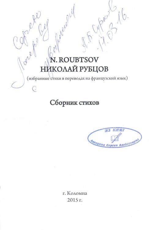 Сборник стихов = Recueil de poemes : (избранные стихи в переводах на французский язык) / Николай Рубцов ; [перевод А. Б. Суркова]. - Коломна ; Москва : Информ-Право, 2015. - 41 с. : цв. фото ; 21 см. - Рубцовиана. - Рубцовская коллекция. - Книга с шрифтовым и художественным экслибрисами С. А. Лагерева. - На титульном листе автограф автора переводов А. Б. Суркова: "Сергею Лагереву с уважением. А. Б. Сурков. 11.03.16". - Автор также на французском языке: N. Roubtsov. - Текст параллельно на французском и русском языках. - 16+. Для детей старше 16 лет. - ISBN 978-5-98492-260-9 : 605-00, 500 экз.