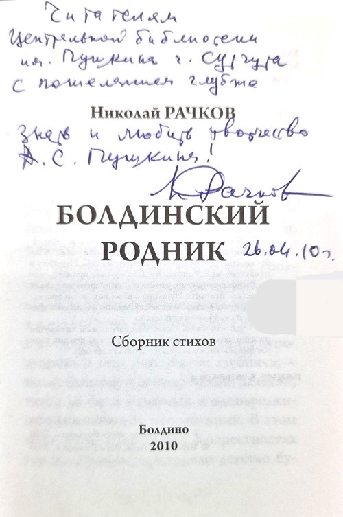 Болдинский родник : сборник стихов : [12+] / Николай Рачков ; предисловие Е. П. Титкова. - 3-е изд. - Нижний Новгород : Бегемот, 2010. - 76, [2] с. : ил. ; 14 см. - Дар. - Кн. с автогр. авт. - Ред. кн. (2010). - 1000 экз. - Дар С. А. Лагерева. - 12+. Для детей старше 12 лет. - ISBN 978-5-901086-96-4 (в обл.) : 70-00.