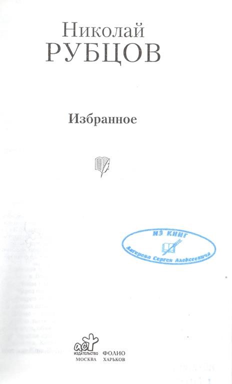 Избранное / Николай Рубцов. - Москва ; Харьков : АСТ : Фолио, 2010. - 349, [1] с. ; 21 см. - (Книга на все времена). - Рубцовиана. - Рубцовская коллекция. - Книга с шрифтовым и художественным экслибрисами С. А. Лагерева. - ISBN 978-5-17-061973-3 (АСТ). - ISBN 978-966-03-4884-4 (Фолио) : 505-00, 2000 экз.